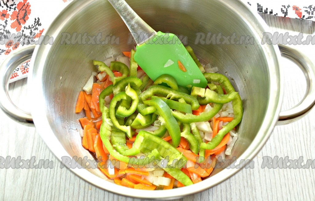 Сладкий болгарский перец, очищенный от семян и плодоножки, нарезаем полосками, выкладываем к обжаренным овощам, перемешиваем, обжариваем 2-3 минуты.