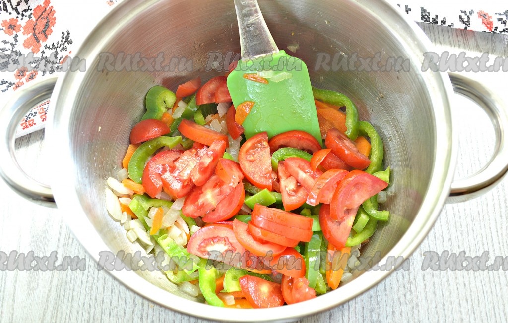 Затем выкладываем помидоры, нарезанные ломтиками, перемешиваем. Помидоры вскоре дадут сок, поэтому овощи уже будут тушиться. Томим их 3-4 минуты, не забывая иногда помешивать, чтобы овощи не подгорели.