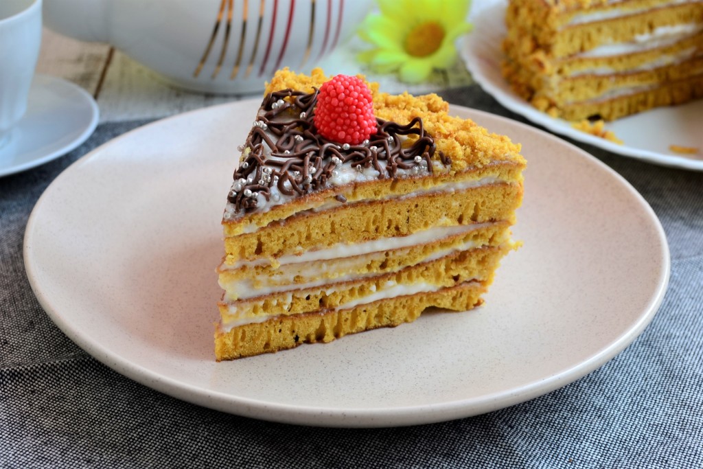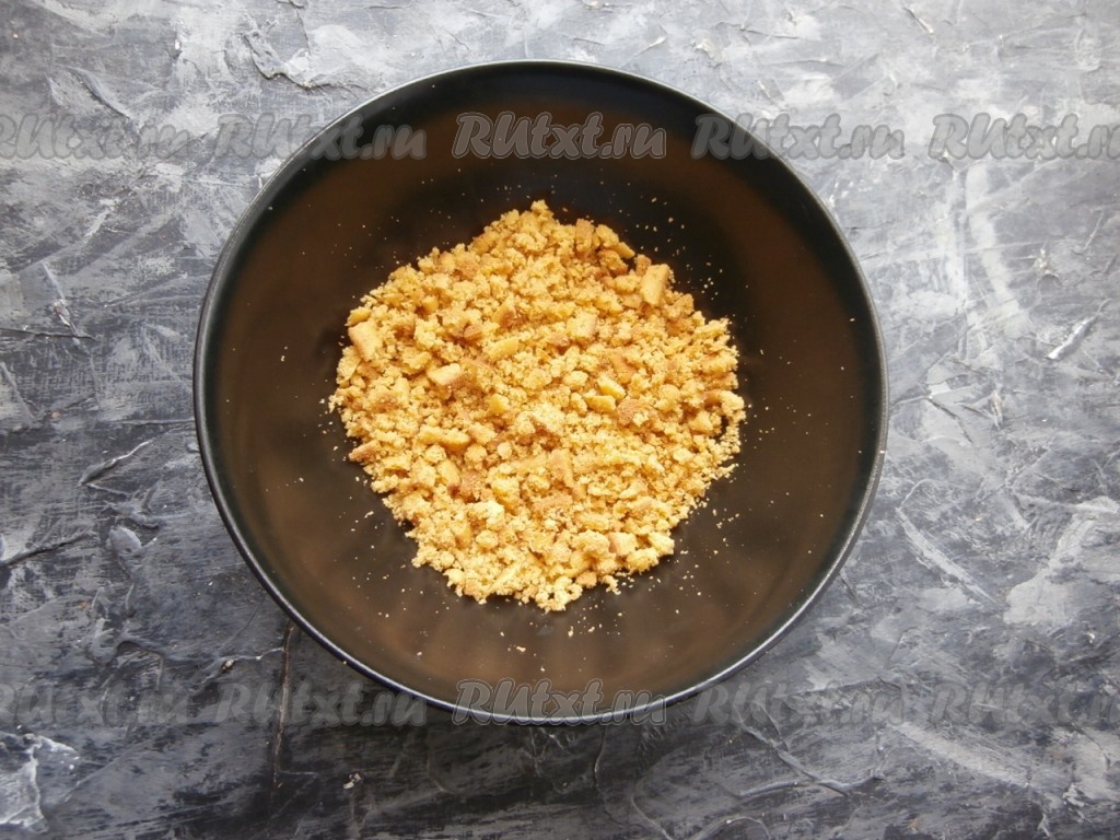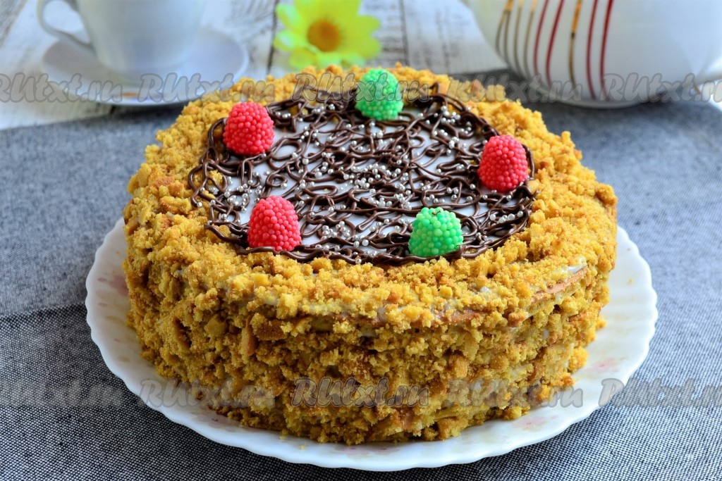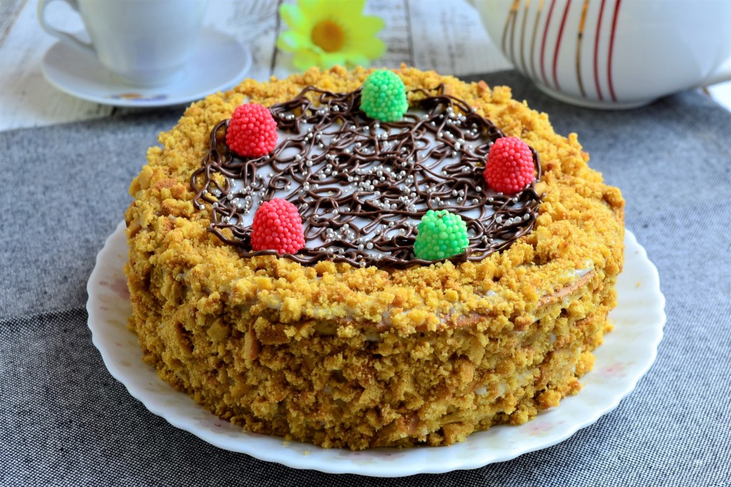 Бока и верх медовика также смазать сметанным кремом. Обсыпать крошкой из размолотых обрезков коржей бока торта и часть верха. Поместить тортик в холодильник на 1-1,5 часа.