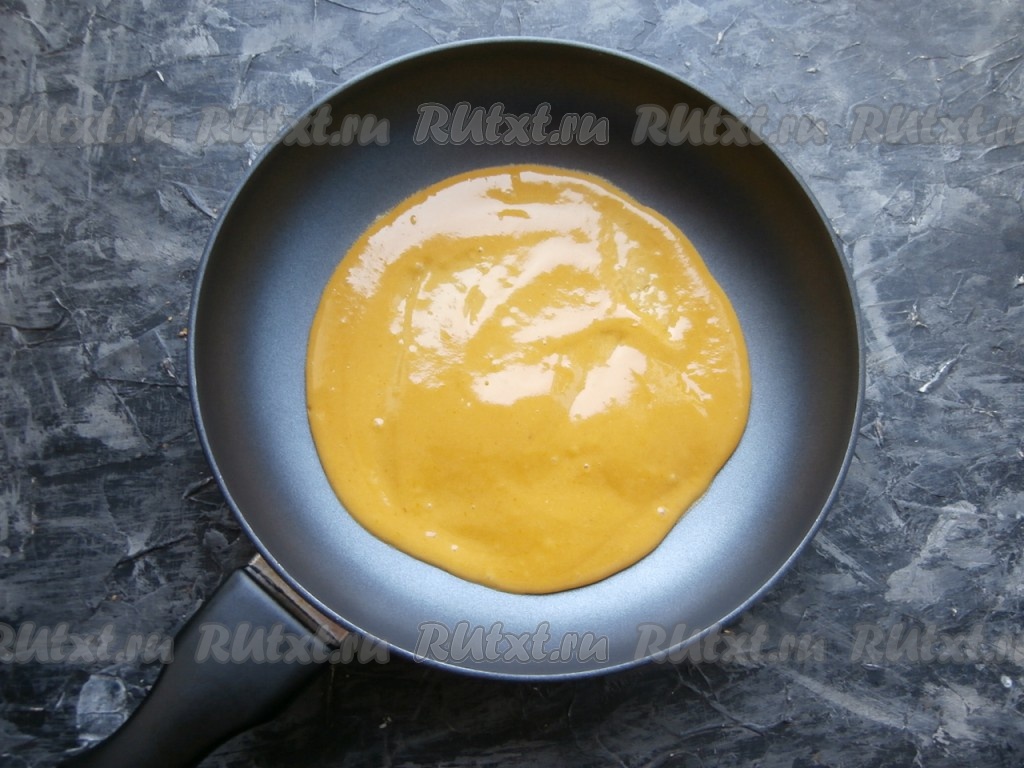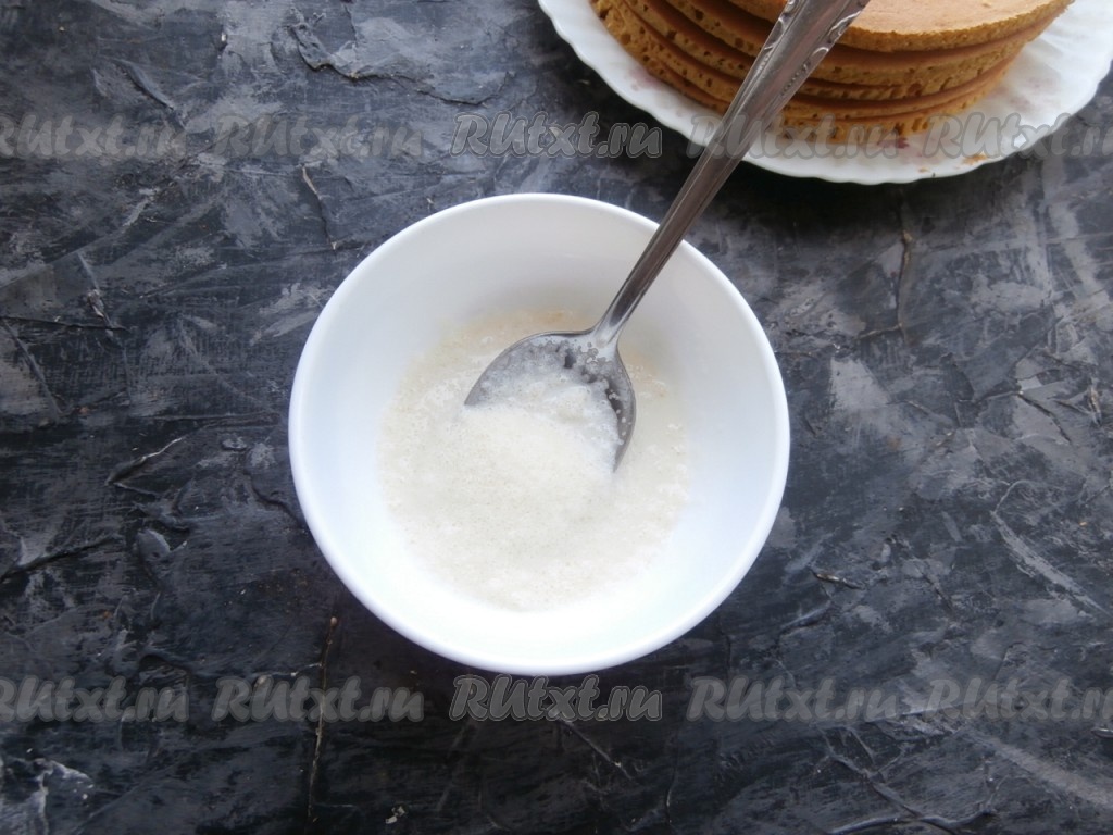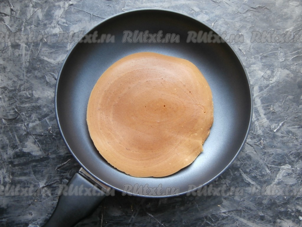Сковороду накрыть крышкой и на небольшом огне печь корж около 40 секунд, после чего его лопаткой перевернуть и печь ещё секунд 20-30, затем переложить на тарелку. Испечь все коржи (у меня получилось 5 штук).