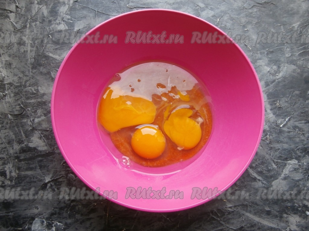 В отдельную миску разбить 3 сырых яйца, добавить соль.