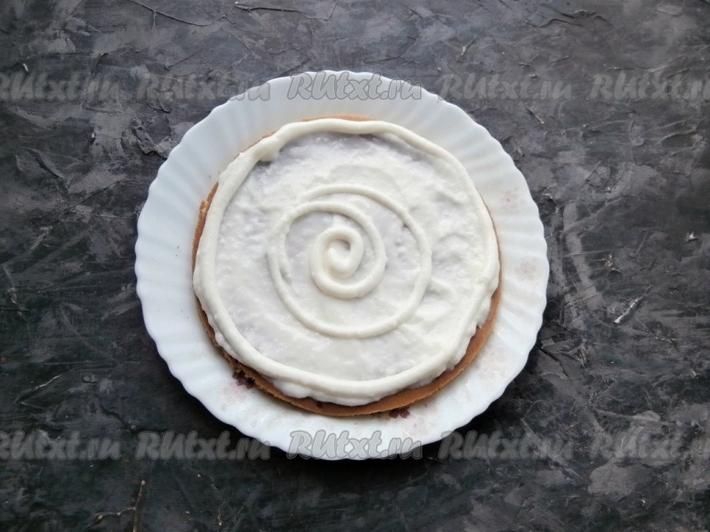 Затем подготовленные медовые коржи смазывать сметанным кремом, выкладывая их друг на друга и собирая тортик.