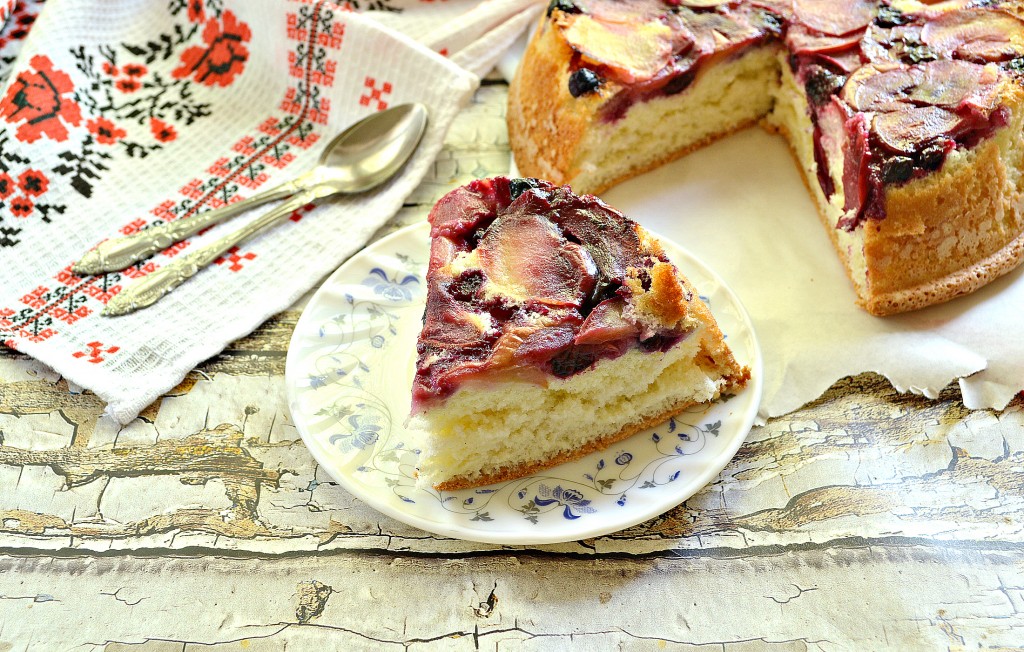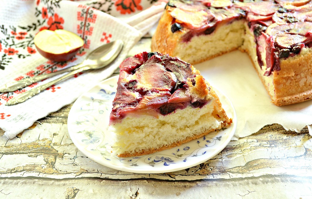 Остужаем пышную, ароматную, нежную шарлотку с яблоками и чёрной смородиной, разрезаем на кусочки и подаём к чаепитию.