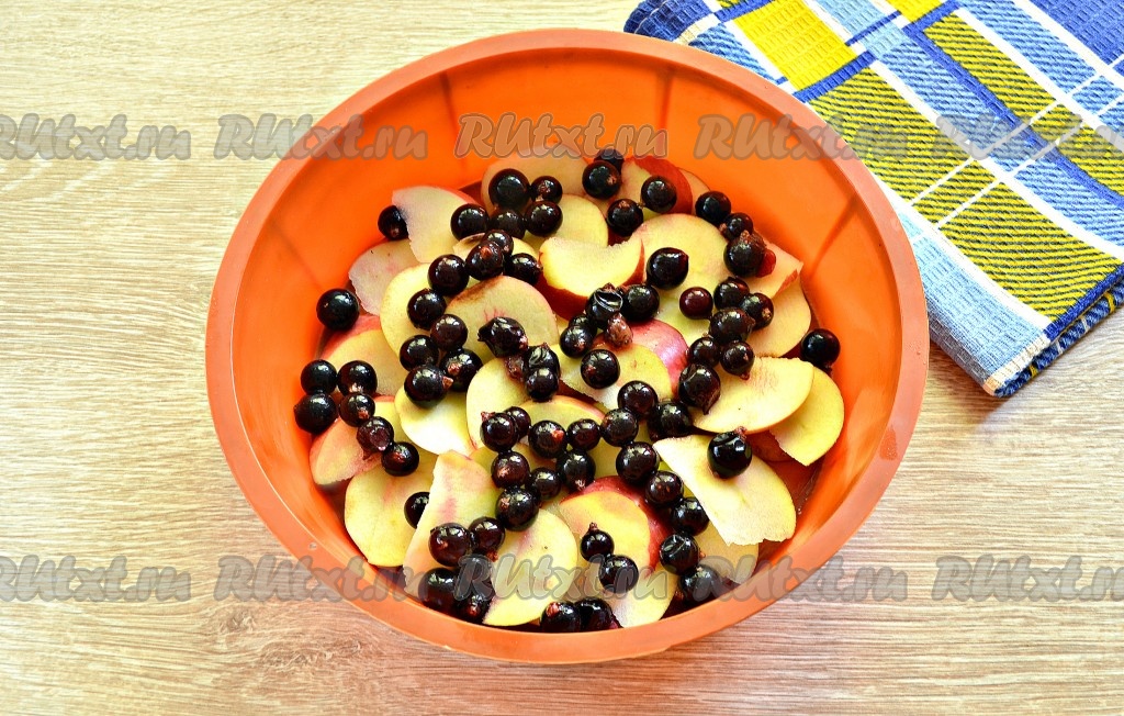 Форму для выпечки (у меня форма диаметром 18 см) смазываем кусочком сливочного масла. Яблоки моем и нарезаем тонкими ломтиками (кожуру можно не срезать). Свежую чёрную смородину отделяем от веточек, если они есть, промываем, обсушиваем слегка (если ягоды заморожены, то просто, достав из морозилки, оставляем их на несколько минут при комнатной температуре, размораживать их не нужно). В смазанную маслом форму выкладываем яблоки, сверху раскладываем чёрную смородину.