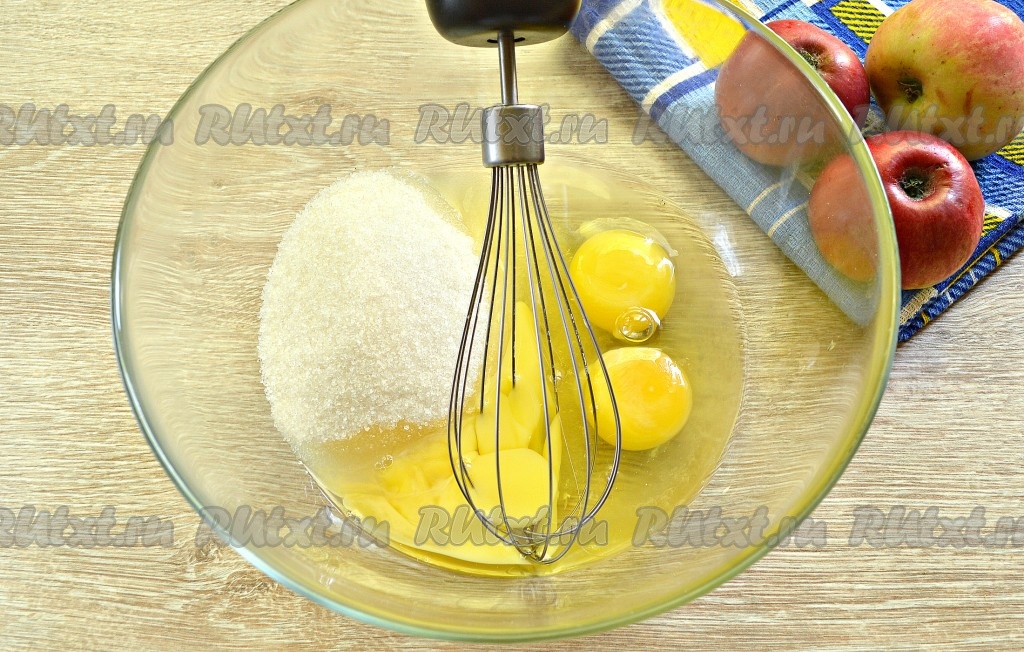 Тесто для шарлотки замешивается очень просто и достаточно быстро, поэтому сразу включаем духовку, выставляем температуру 180 градусов. Приступаем к замешиванию теста, для этого в миску разбиваем куриные яйца, подсыпаем к ним сахар.