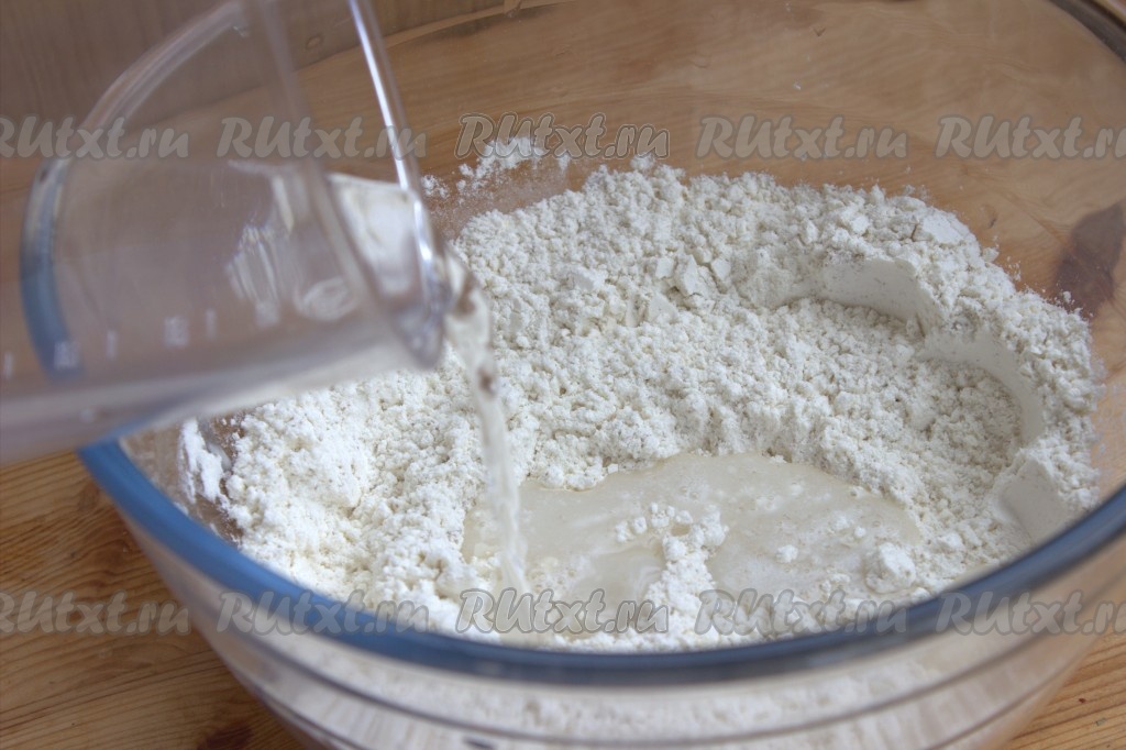 Влить тёплую воду (температура воды должна быть около 40 градусов), хорошо перемешать тесто ложкой.