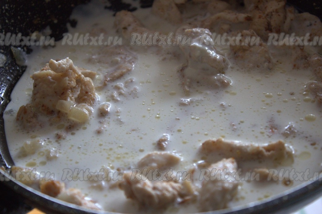 Затем к обжаренному куриному филе добавить жирные сливки (или 2 столовые ложки жирной сметаны, смешанной с 1/2 чайной ложки сахара), перемешать и тушить до загустения соуса (у меня на загустение соуса потребовалось 8 минут), снять с огня и дать полностью остыть.