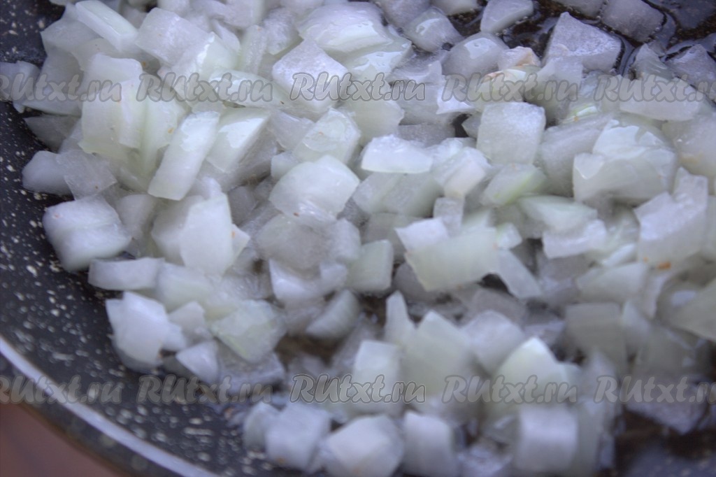 В сковороду влить растительное масло, выложить очищенный и нарезанный достаточно мелко лук, обжарить его на среднем огне до прозрачности (в течение минут 5), не забывая помешивать.
