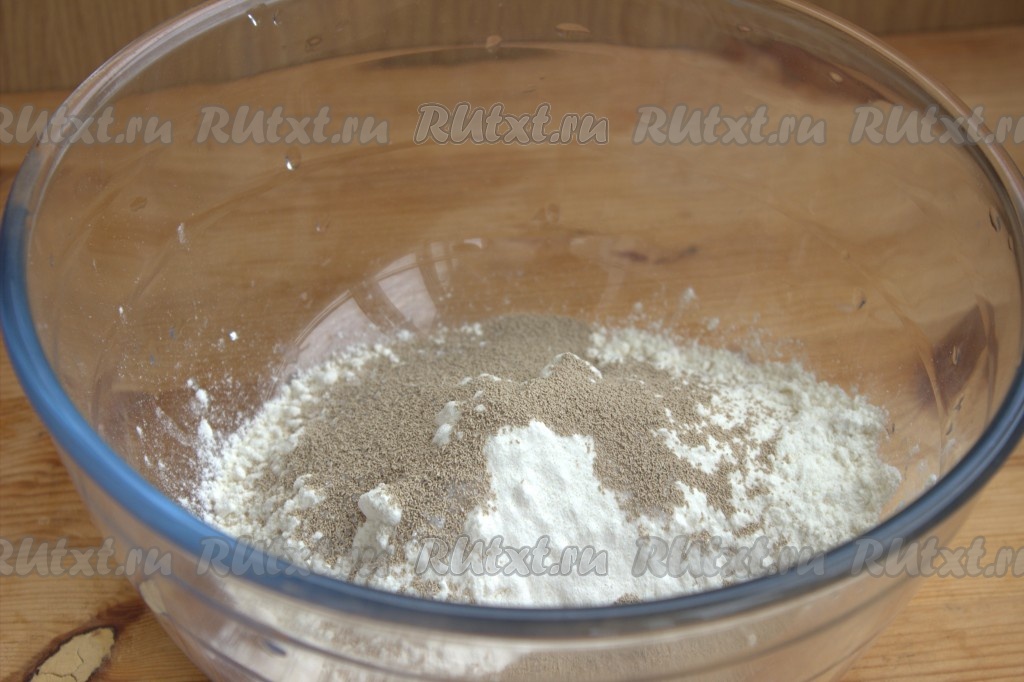 Добавить сахар, соль, дрожжи и хорошо перемешать с мукой.