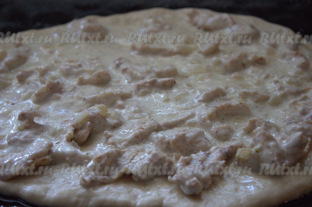 Подошедшее тесто разделить на 2 равные части (мы будем печь 2 пиццы "Жульен"). Одну часть теста выложить на рабочую поверхность, припылённую мукой, раскатать в пласт диаметром, примерно, 30-35 сантиметров и переложить на противень, застеленный бумагой для выпечки. Не забывайте, что мы будем готовить 2 пиццы, поэтому и ингредиенты для начинки нужно делить на 2 части. На тесто выложить половину остывшего куриного филе в сливочном соусе со сковороды.