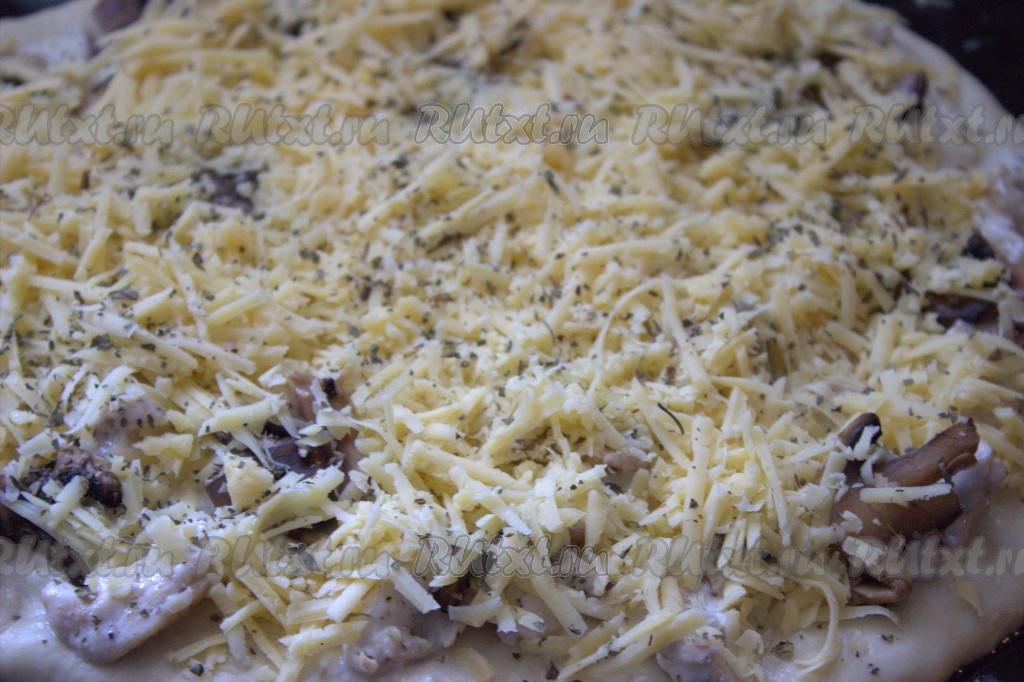 Затем начинку обильно посыпать натёртым сыром и, по желанию, присыпать любимыми специями (я использовала приправу "Итальянские травы"). Выпекать пиццу "Жульен" с курицей и грибами в заранее разогретой духовке при температуре 200 градусов минут 20.
