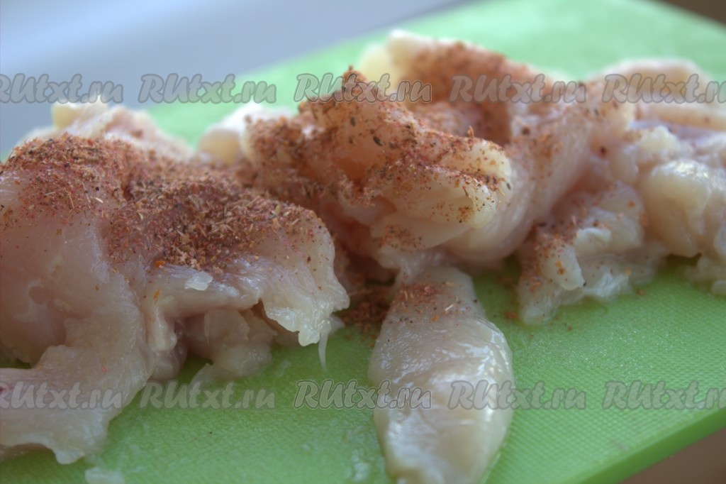 Куриное филе вымыть, нарезать на тонкие кусочки, посолить, приправить по вкусу специями и оставить его на 10-15 минут.