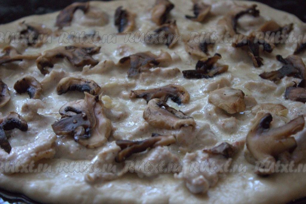 Шампиньоны вымыть, обсушить, нарезать на тонкие пластины (я использовала замороженные грибы), половину подготовленных грибочков выложить на тесто, покрытое куриным мясом в сливках.