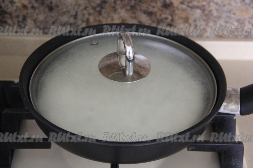 Накрыть сковороду крышкой и готовить ленивое хачапури с творогом на среднем огне 5 минут.