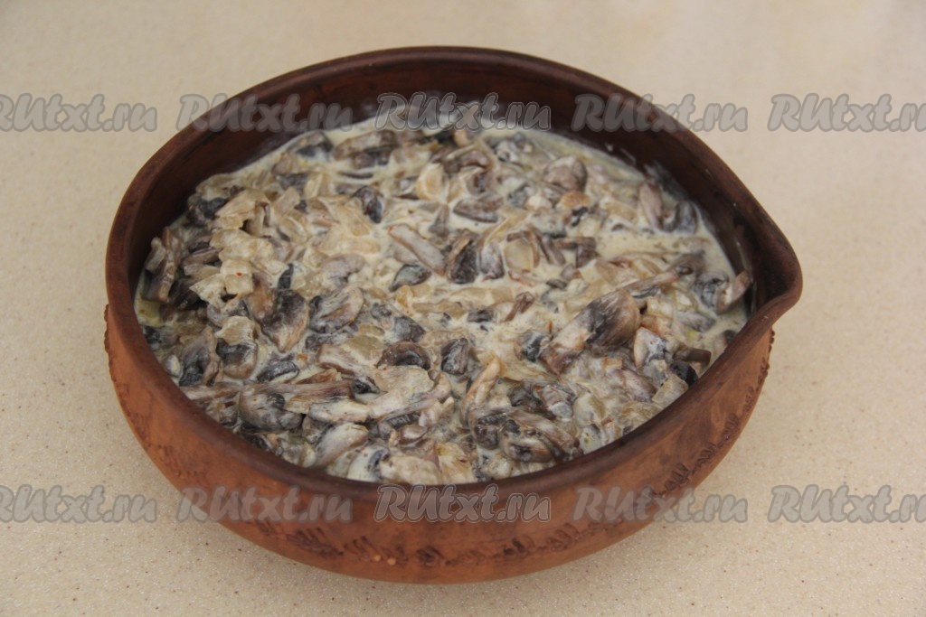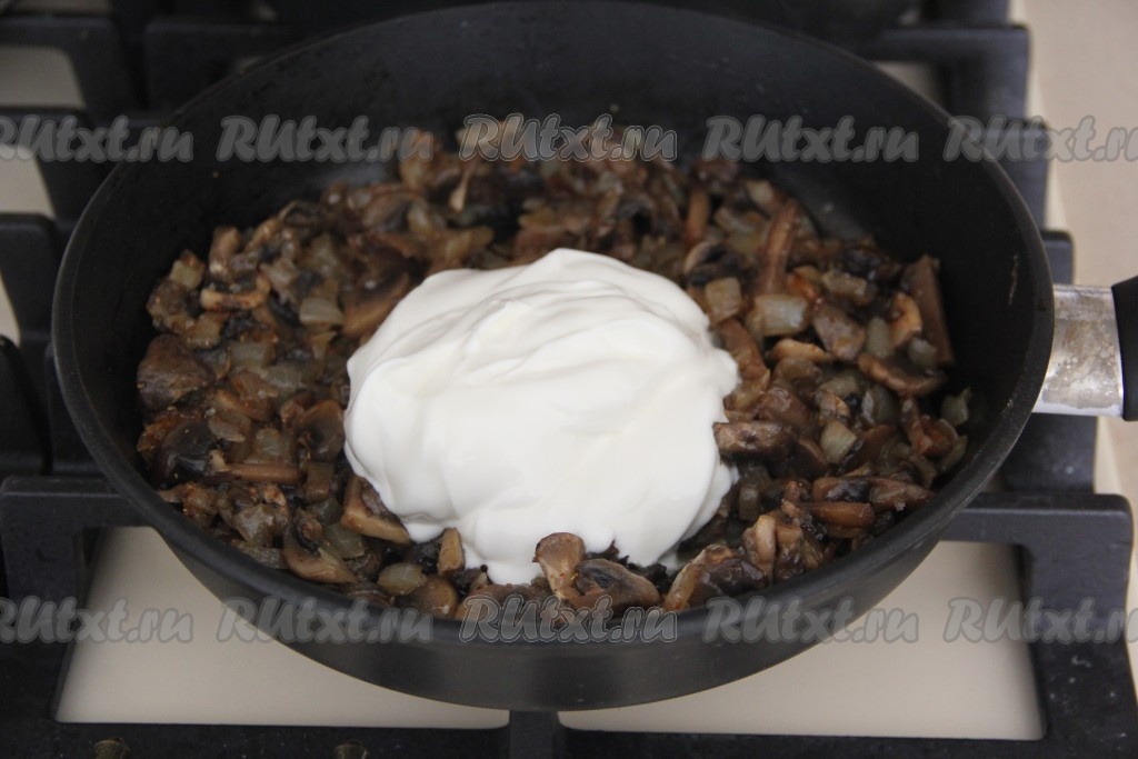 Когда грибы обжарятся добавить к ним сметану, перемешать.