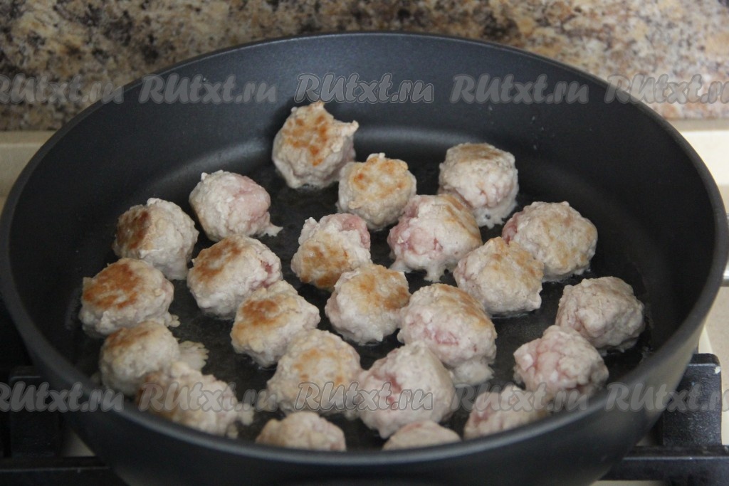 Обжарить тефтели до золотистого цвета на среднем огне со всех сторон. Не надо доводить мясо до готовности, достаточно, чтобы тефтельки подрумянились.
