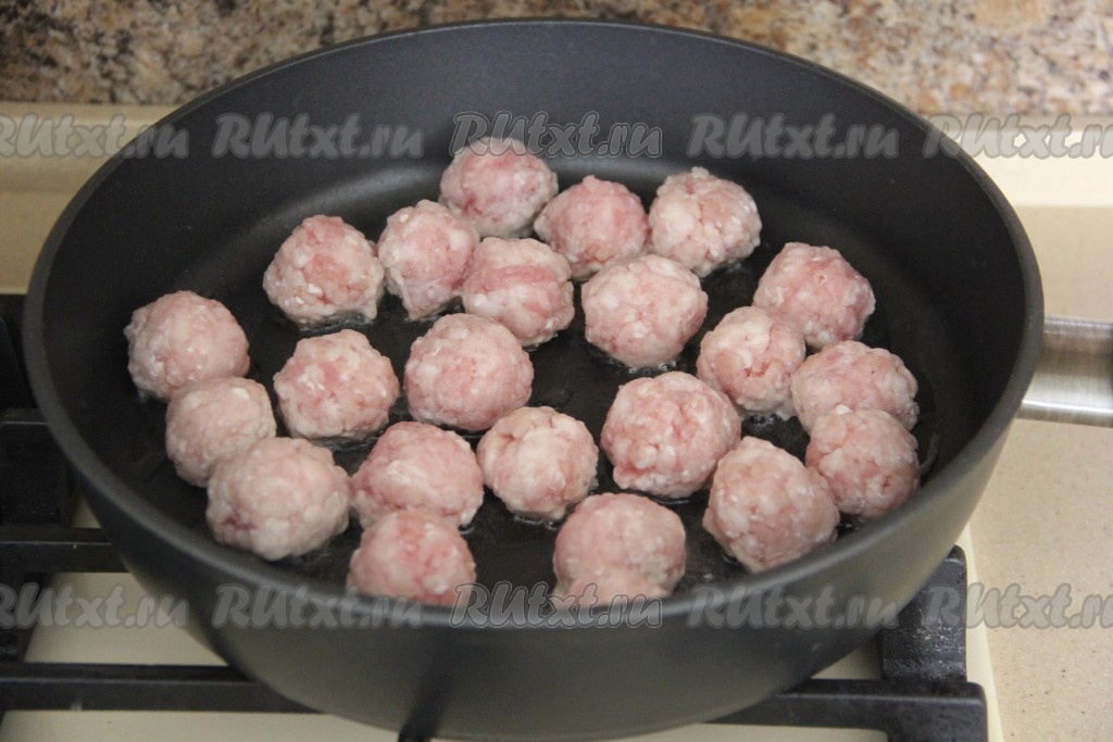 Фарш посолить. Из фарша сформировать тефтели размером с крупный грецкий орех. Выложить их на отдельную сковороду, уже разогретую с небольшим количеством растительного масла.