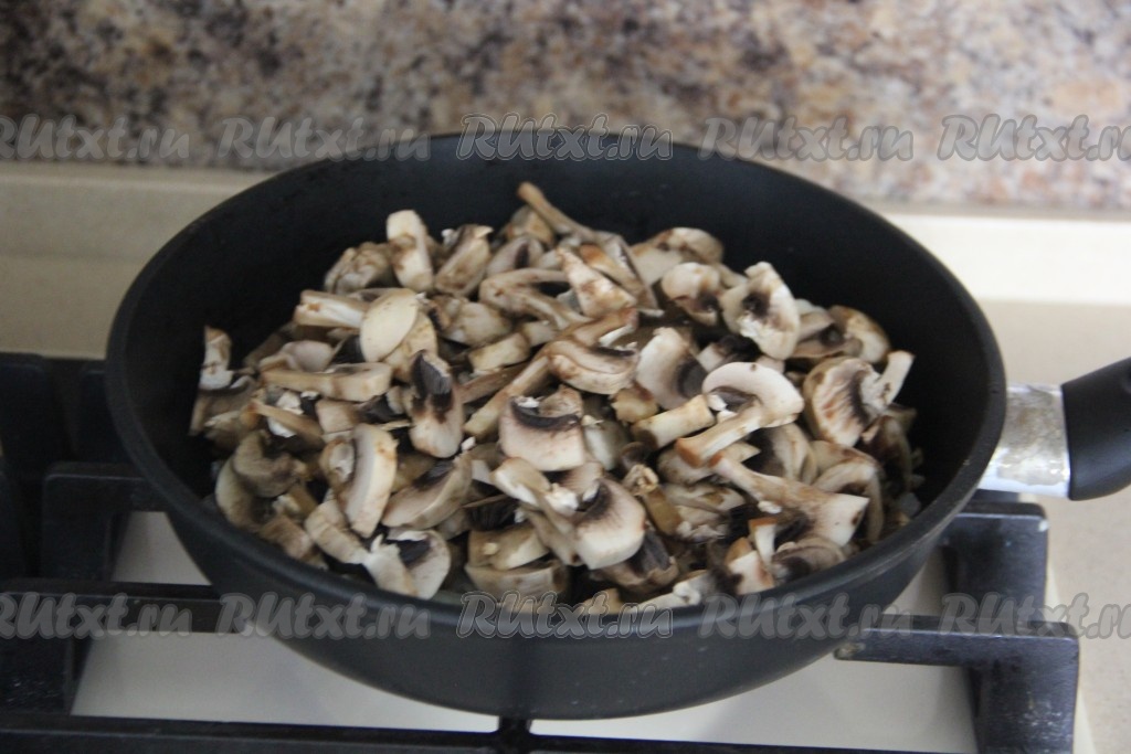 Шампиньоны (у меня свежие) промыть и нарезать на пластинки. Если вы готовите с лесными грибами, то тщательно их переберите, промойте, а затем отварите в течение 25-30 с момента начала кипения воды, переложите отваренные грибочки в дуршлаг, чтобы стекла лишняя вода, а после этого, если необходимо, нарежьте некрупно. К обжаренному луку выложить подготовленные грибы.