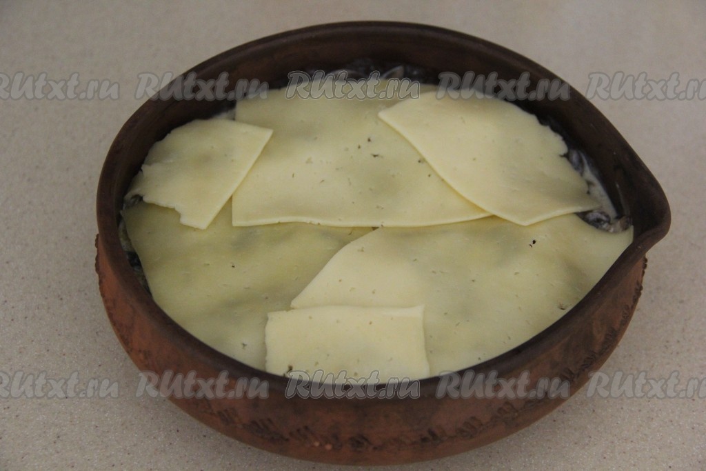 Накрыть соус тонко нарезанным (или натёртым на крупной тёрке) сыром.