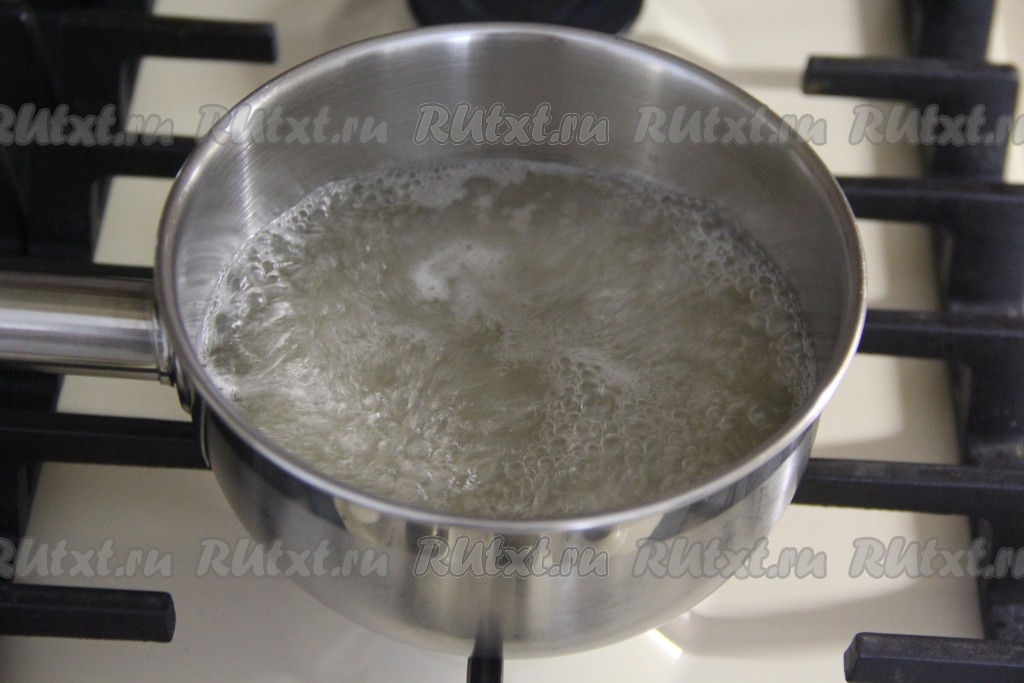В сотейник (или ковшик) влить 250 мл воды, всыпать сахар, поставить на огонь.