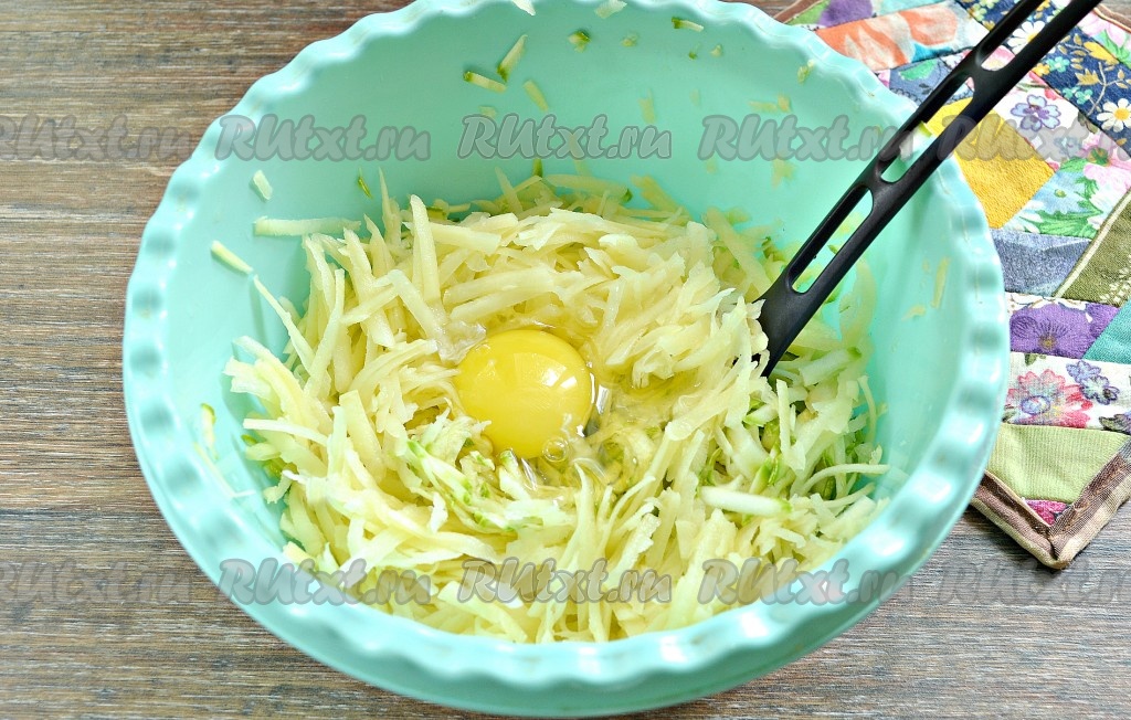 В миску с картофельно-кабачковой массой разбиваем яйцо, хорошо перемешиваем.
