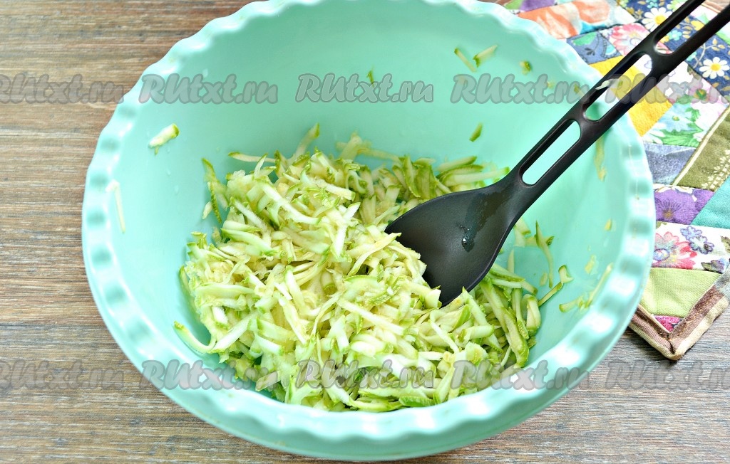 Если вы возьмёте кабачок с тонкой шкуркой, тогда его можно готовить вместе с кожурой, его достаточно будет тщательно вымыть, обрезать кончики с двух сторон. Если будете использовать кабачок с жёсткой кожурой и крупными семечками, тогда семечки нужно будет удалить, а кожуру - срезать. 150 грамм подготовленного кабачка натираем на крупной тёрке. Получившуюся кабачковую массу отжимаем от лишнего сока (я беру частями кабачковую массу в руку и, сжимая в ладони, отжимаю от лишнего сока). Выделивший сок нам больше не понадобится. Отжатую кабачковую массу перекладываем в достаточно глубокую миску.