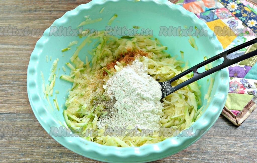 В получившуюся кабачково-картофельную массу всыпаем муку, солим на свой вкус, сдабриваем специями (я приправила молотой паприкой и чёрным молотым перцем), тщательно перемешиваем.