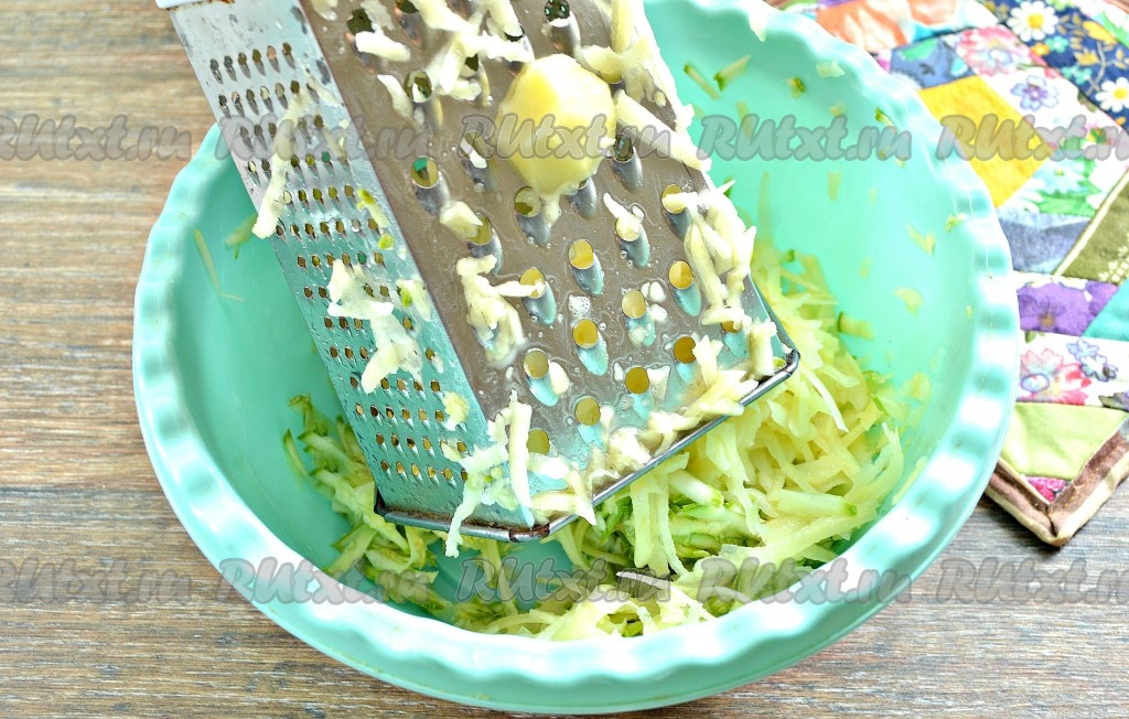 Очищаем картофель и сразу натираем на крупной тёрке в миску с кабачковой массой.