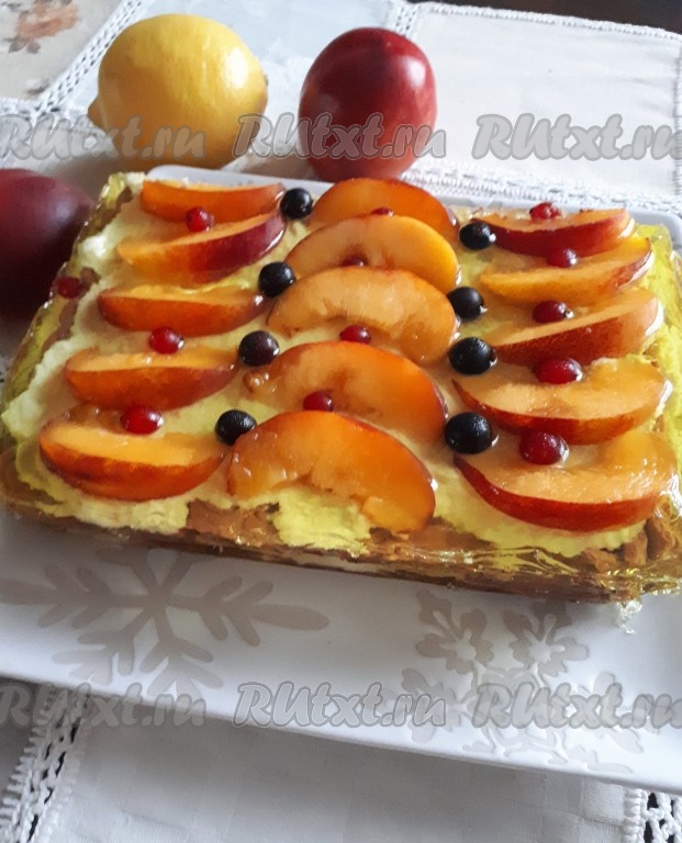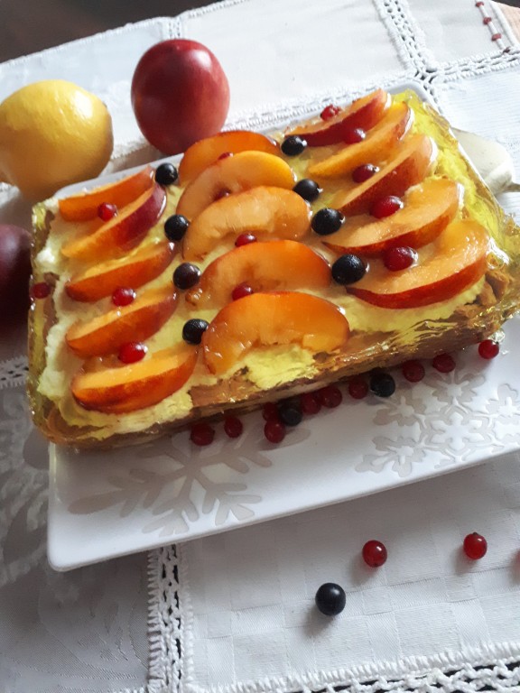 На слой крема выложить в произвольном порядке ягоды и/или дольки фруктов, которые используете для украшения. Я использовала для украшения нектарины, а также чёрную и красную смородину.