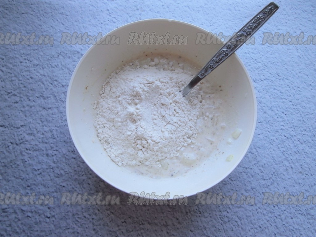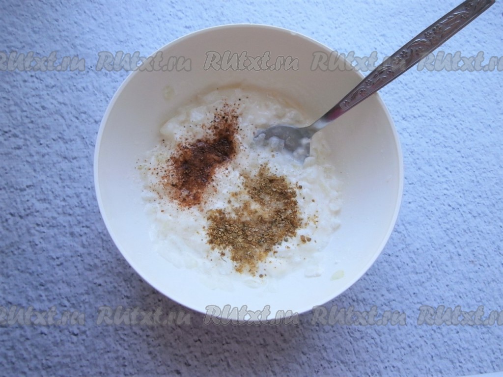 По истечении времени промыть лук холодной водой, откинуть на дуршлаг и оставить на несколько минут, чтобы стекла вода. Затем добавить к луку сырое яйцо и сметану, тщательно перемешать, всыпать соль, смесь перцев и приправу для овощей.