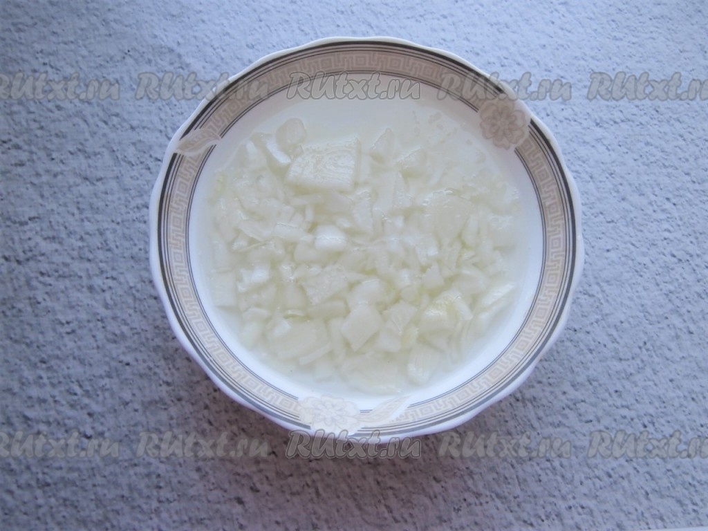 Прежде всего очищенные луковицы нужно мелко нарезать, выложить в достаточно глубокую тарелку, залить лук кипятком и оставить на 7-10 минут.