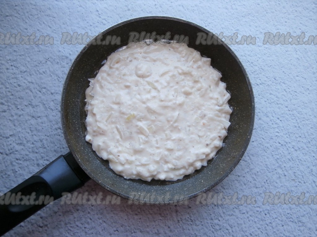 Смесь получится, напоминающей по консистенции тесто для оладий. В холодную сковороду (у меня диаметром 20 см) влить растительное масло, распределить масло по сковороде. Выложить в сковороду луковое тесто, разравнивая его.