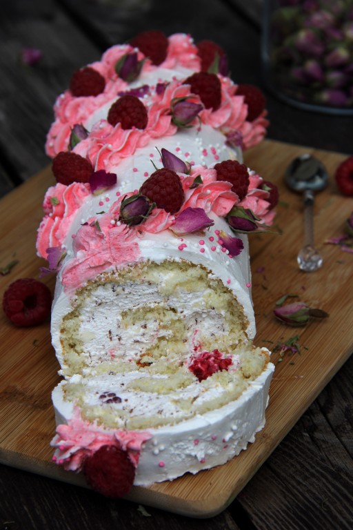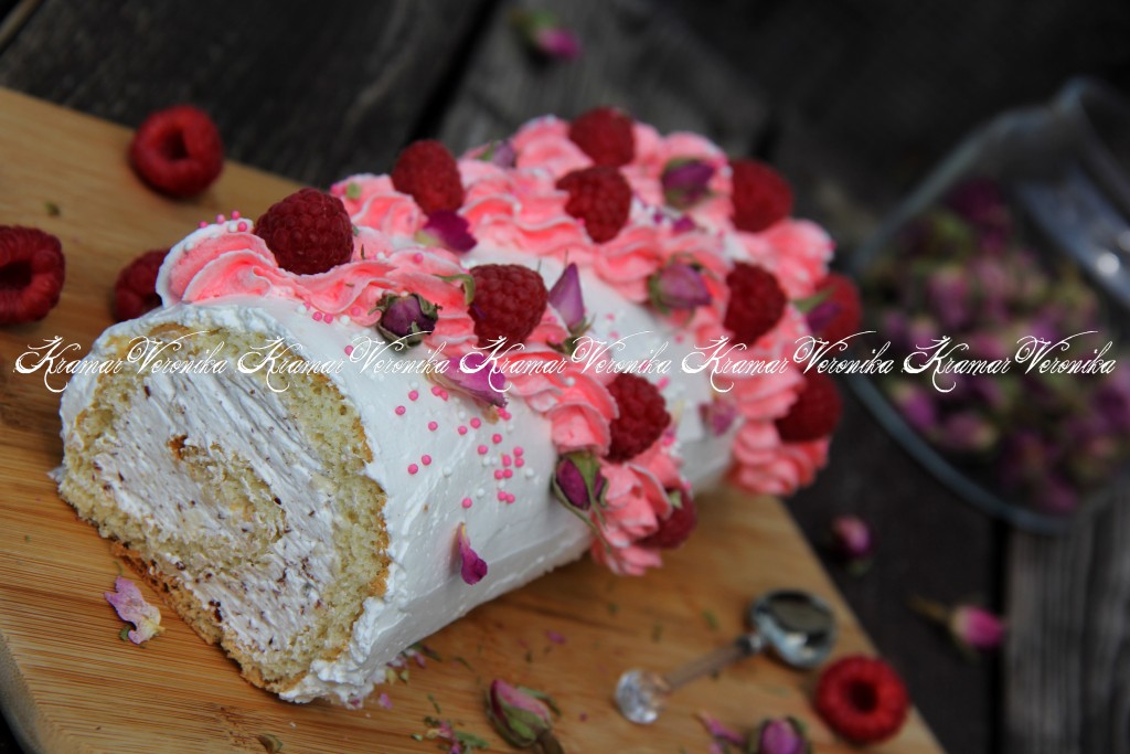 По прошествии двух часов покрыть бисквитный рулет оставшимся крем-чизом. Я окрасила часть крема красителем, выложила в кулинарный мешок с фигурной насадкой и украсила верх рулета. Сверху можно выложить и ягоды. Выпечка получается и нарядной, и очень вкусной, она отлично будет смотреться на праздничном столе или станет прекрасным дополнением к чаепитию в кругу семьи.