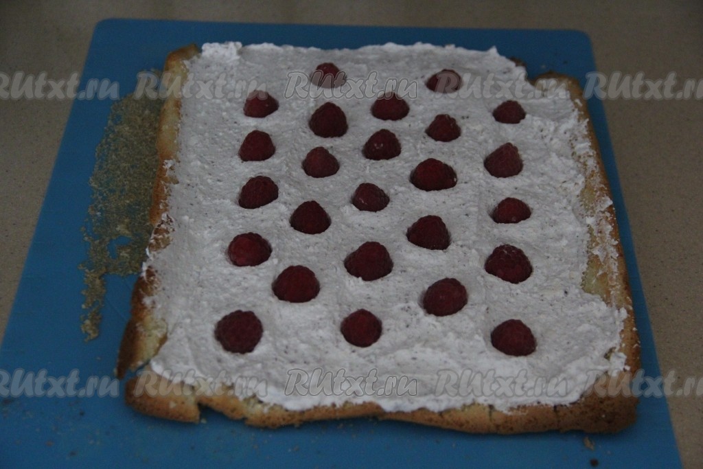 Свернуть бисквит с крем-чизом и малиной в плотный рулет, завернуть в фольгу и убрать в холодильник на пару часов.