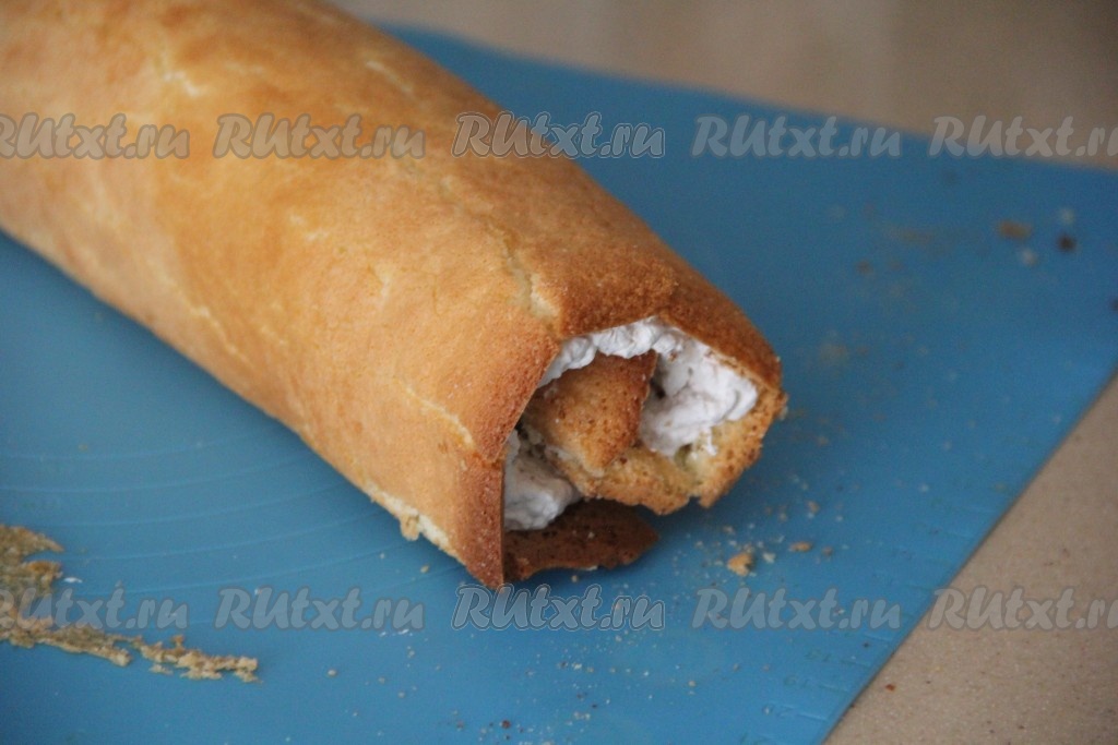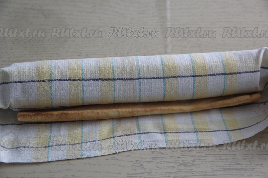 Готовый горячий бисквит переложить на сухое полотенце, снять пергамент и сразу свернуть в рулет вместе с полотенцем, оставить на 1 час.