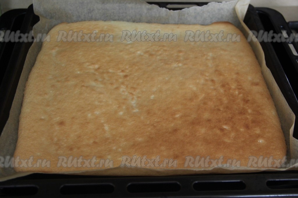 Противень размером 30 см х 30 см застелить пергаментом (или тефлоновым ковриком), выложить тесто и аккуратно разровнять. Выпекать бисквит в разогретой духовке, примерно, 7-10 минут при температуре 200 градусов. Готовый бисквит равномерно поднимется и приобретёт золотистый цвет.