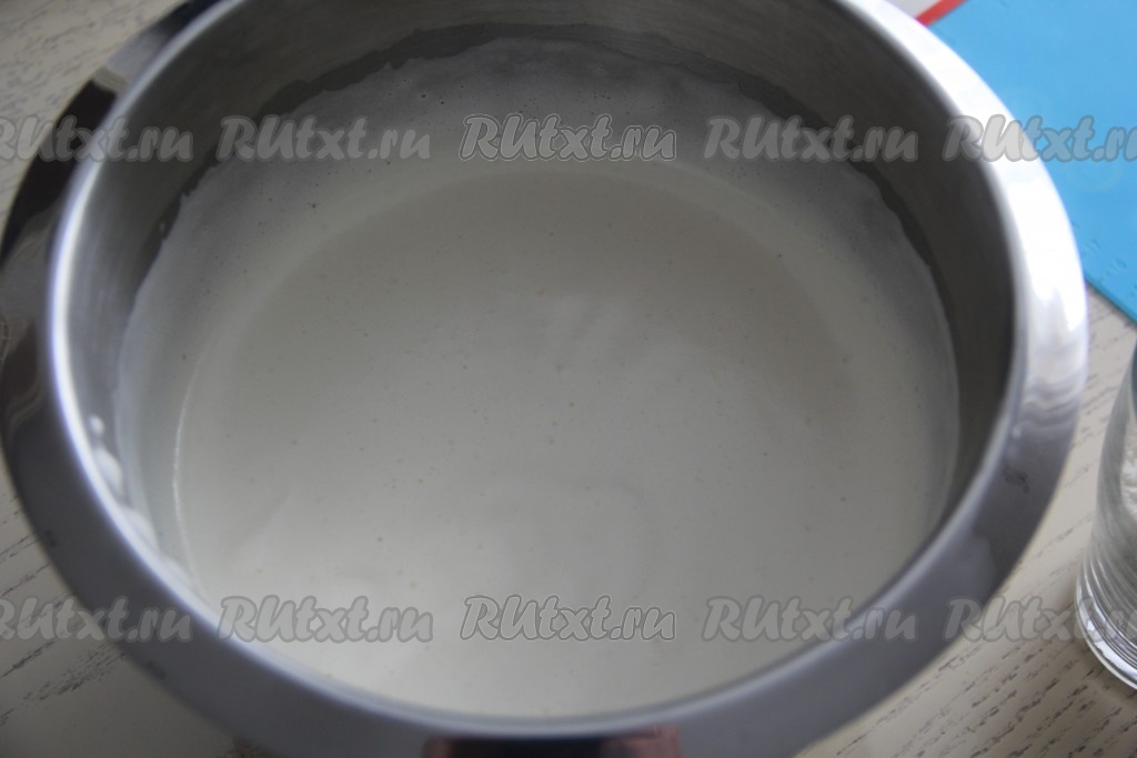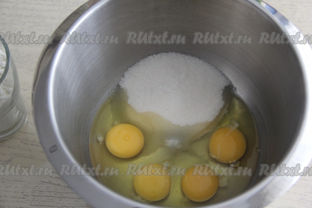 Взбить яйца с сахаром и солью в течение 7-9 минут. Масса должна стать светлой, пышной и сахар должен полностью раствориться.