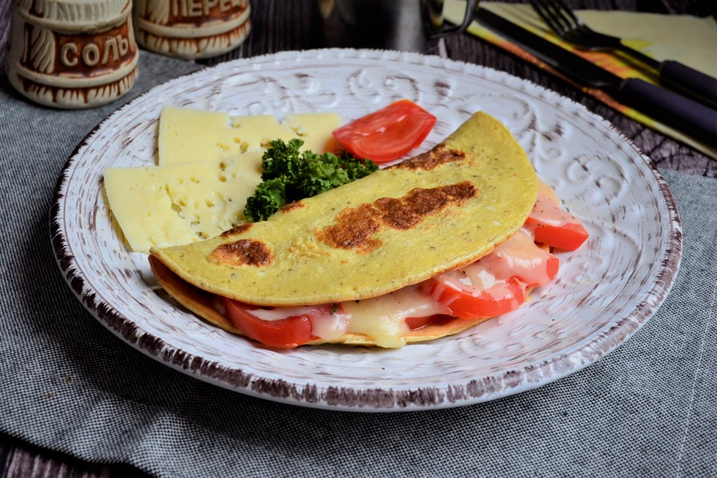 Подавать к столу очень полезный и вкусный овсяноблин, приготовленный с сыром и помидорами, горячим.