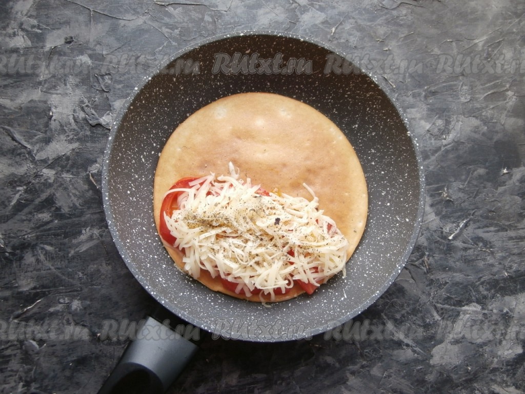 На половину блина выложить помидоры, чуточку их посолить, сверху распределить натёртый сыр, посыпать чёрным молотым перцем, базиликом и итальянскими травами.