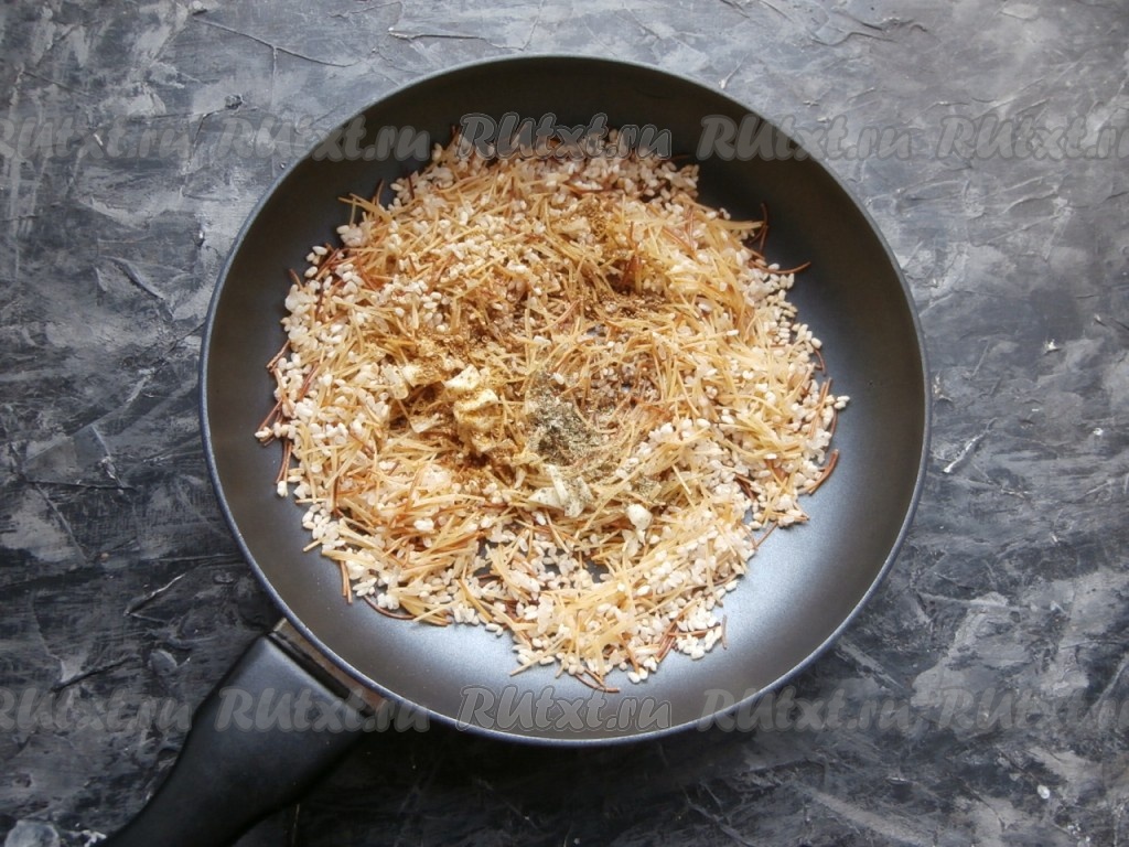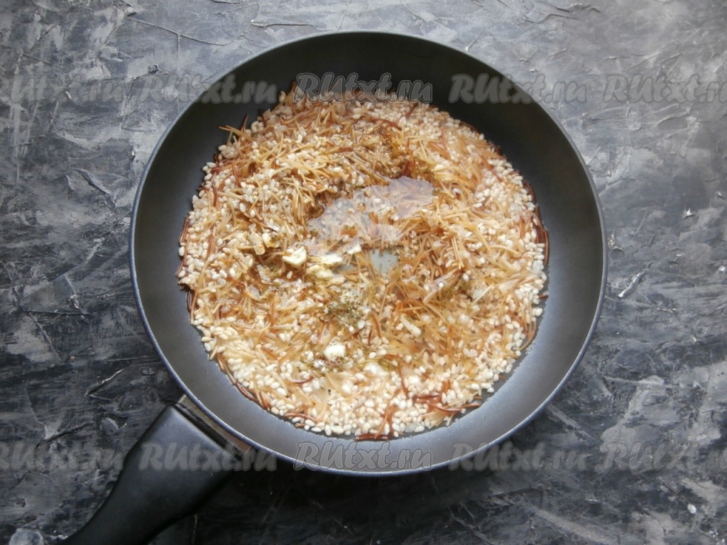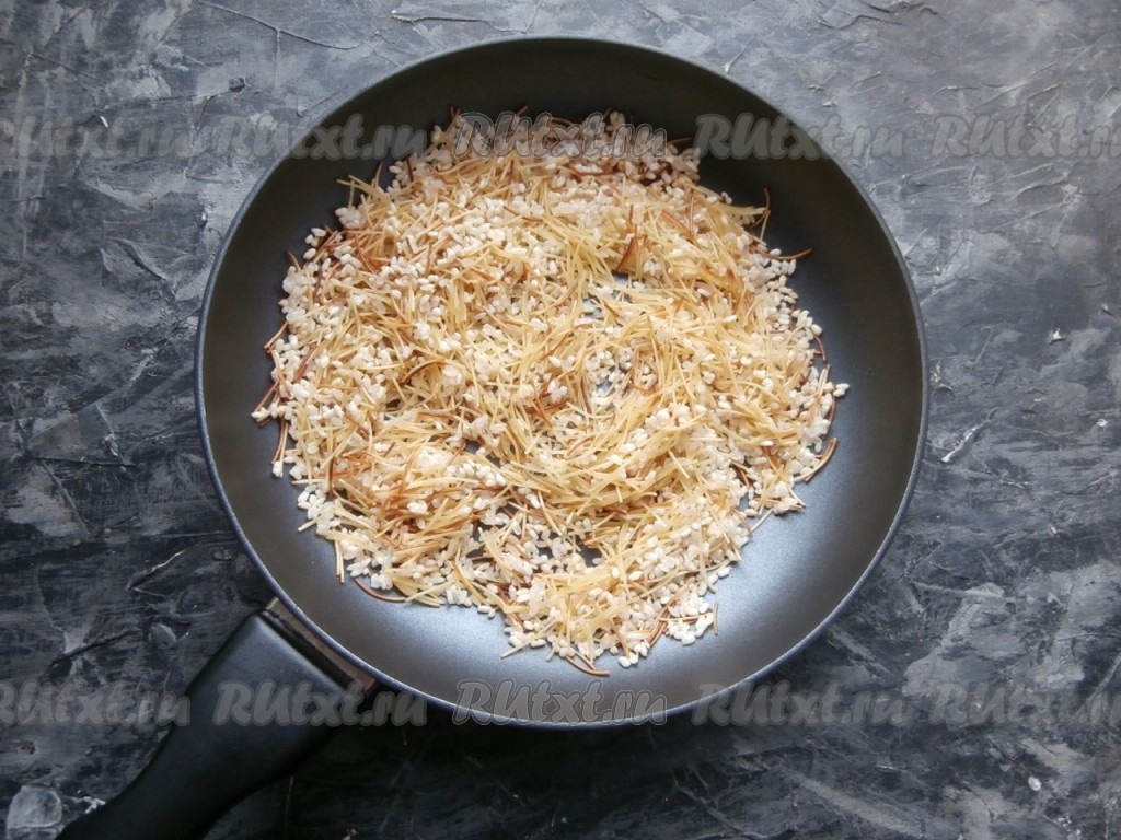 Сковороду разогреть с растительным маслом, выложить рис и вермишель, обжарить их на сильном огне, постоянно помешивая, до румяности вермишели (в течение 3-4 минут).