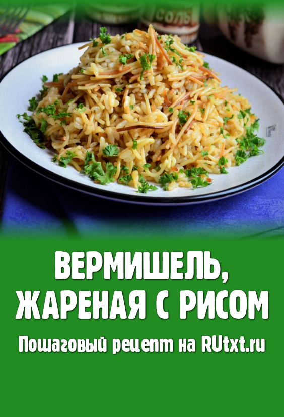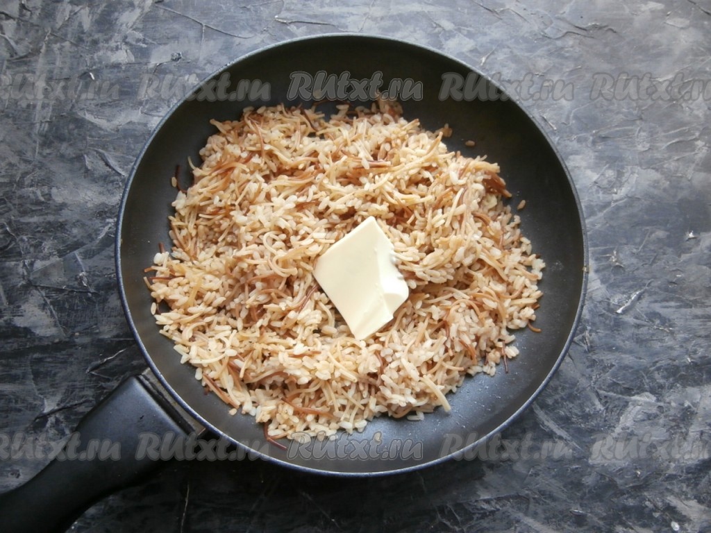 Готовить вермишель, жареную с рисом, накрыв сковороду крышкой, на небольшом огне около 15 минут. После чего огонь выключить, оставить блюдо под крышкой ещё на 10 минут. Затем добавить сливочное масло и перемешать.