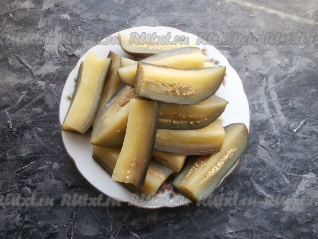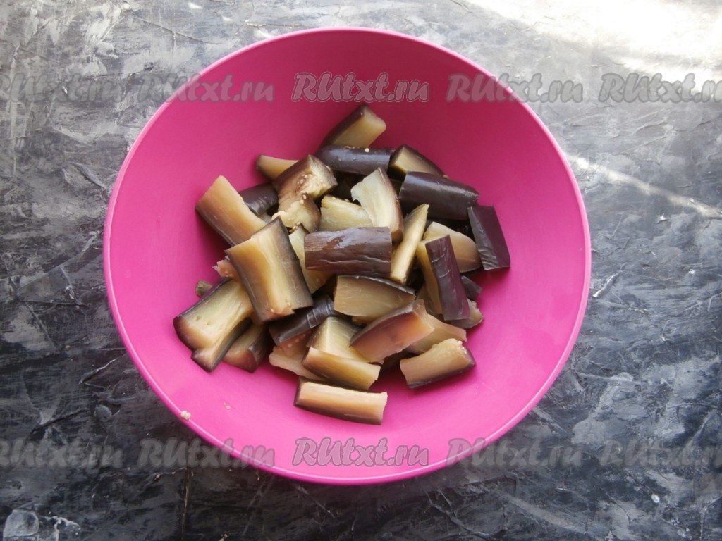 Остывшие баклажаны нарезать на более мелкие брусочки.