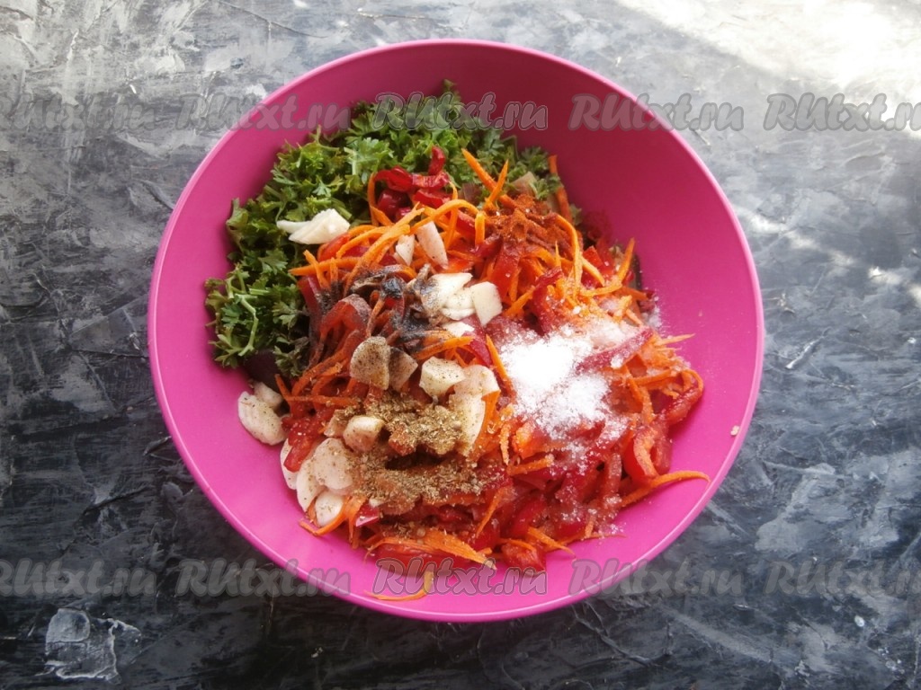 Добавить к морковке нарезанный соломкой болгарский перец и всыпать 0,5 чайной ложки соли, перемешать овощи и оставить на 15-20 минут.