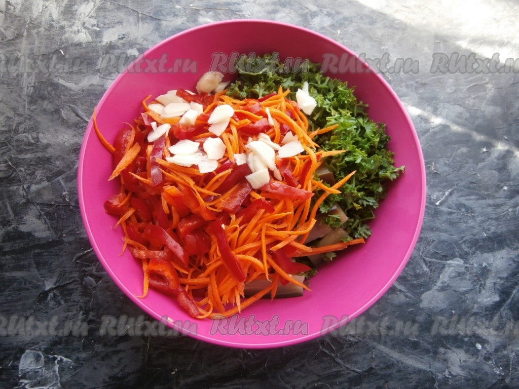 Добавить к баклажанам измельчённую петрушку, нарезанный на кусочки чеснок и просоленные овощи (морковь и болгарский перец).