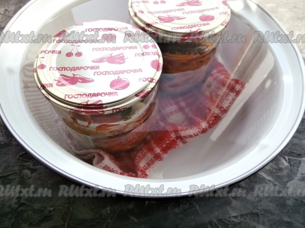 Банки поставить в кастрюлю, на дно которой разместить полотенце (или любую тряпочку), накрыть прокипячёнными крышками. Влить горячую воду, чтобы она была по "плечики" банок. Поместить кастрюлю на огонь, довести воду в кастрюле на среднем огне до кипения, а затем, уменьшив огонь, стерилизовать салат 15 минут.