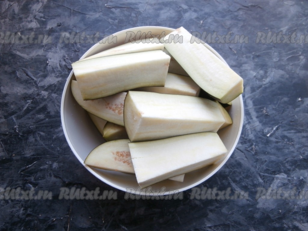 Баклажаны помыть, разрезать каждый на 6-8 частей-брусков. Морковь и зубчики чеснока очистить, удалить семена с плодоножкой из болгарского перца.