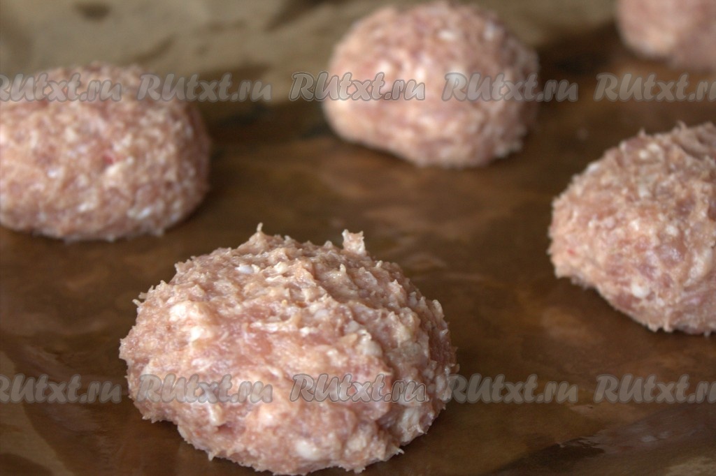Противень для запекания застелить пергаментной бумагой и слегка смазать растительным маслом. Из получившегося фарша сформировать шарики одинакового размера и выложить на противень на небольшом расстоянии друг от друга (у меня получилось 5 шариков).