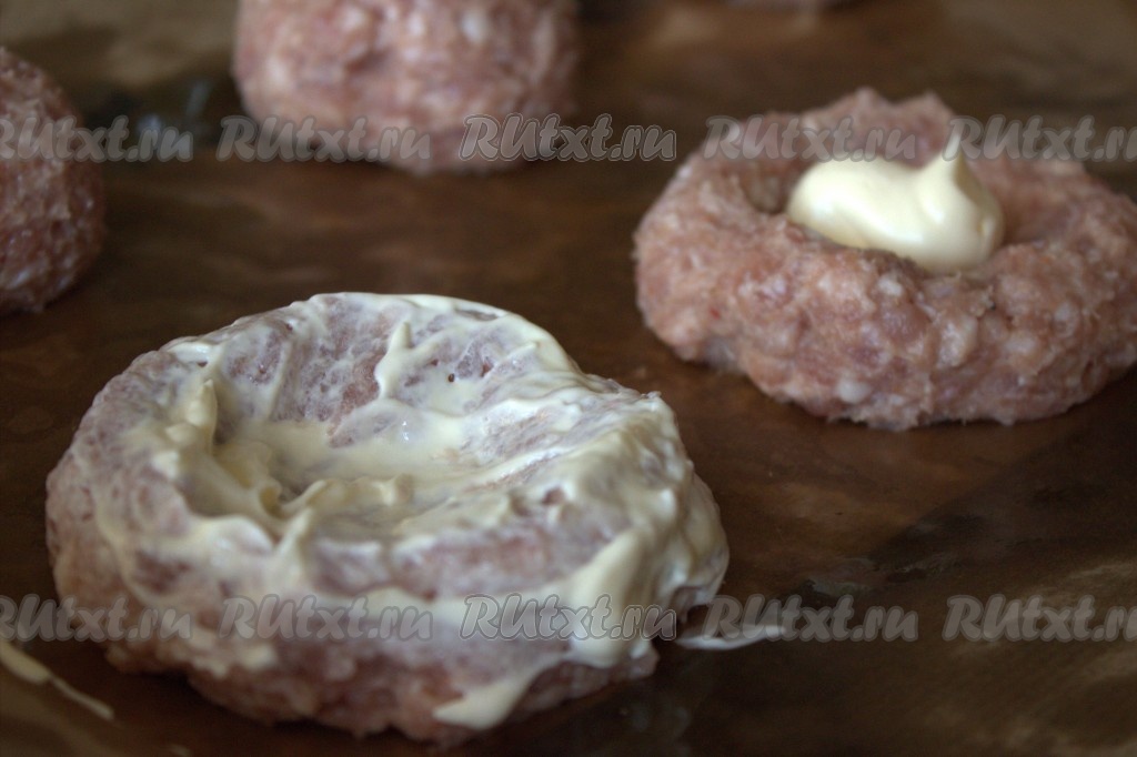 Затем каждый шарик из мясного фарша приплюснуть и сделать небольшое углубление в центре (сделав так называемую "ватрушку"). Каждую мясную ватрушку смазать майонезом.