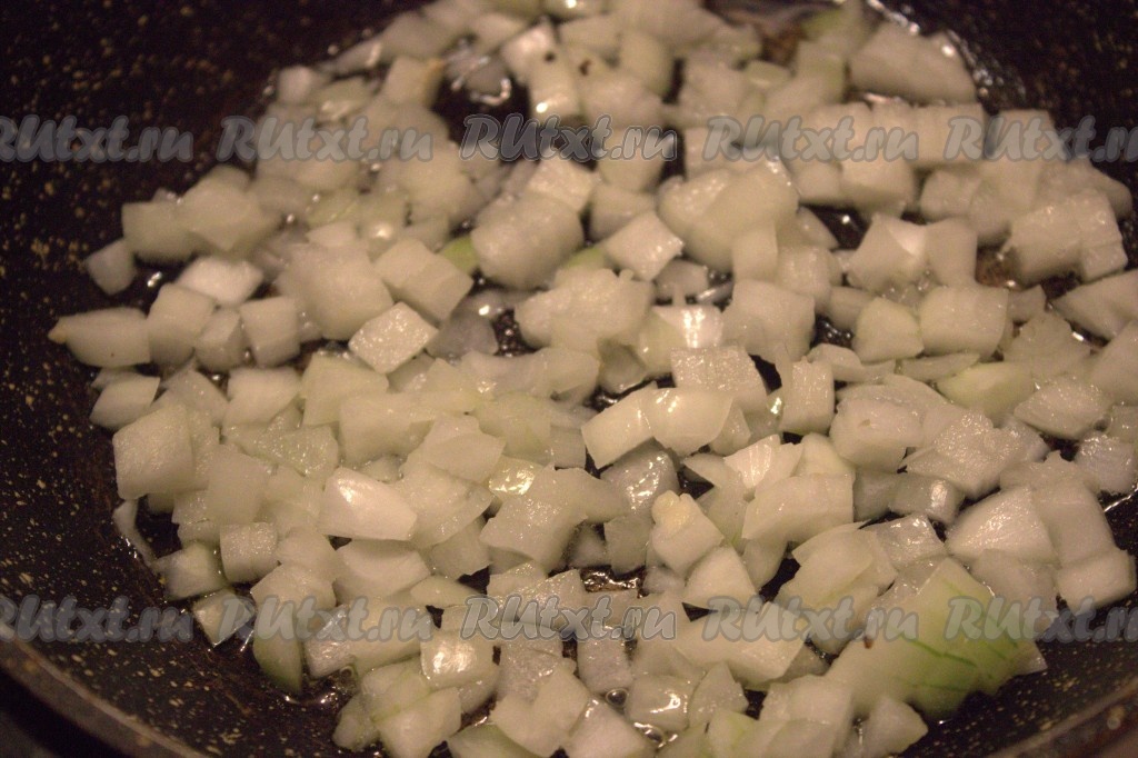 Выложить нарезанную луковицу в сковороду, хорошо прогретую с растительным маслом, и обжаривать минуты 3-4 (до прозрачности лука).