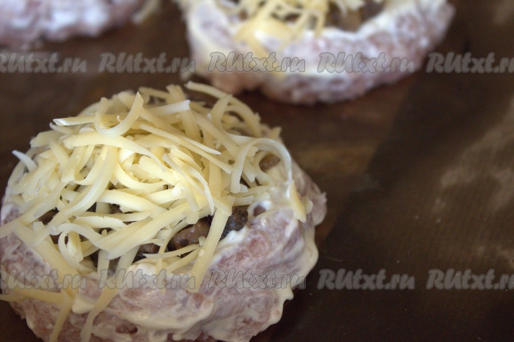Затем в каждое углубление мясной ватрушки вложить часть остывшей грибной начинки. Сверху посыпать начинку натёртым сыром. Поставить противень с мясными ватрушками в разогретую духовку и запекать их минут 30-35 при температуре 180 градусов.